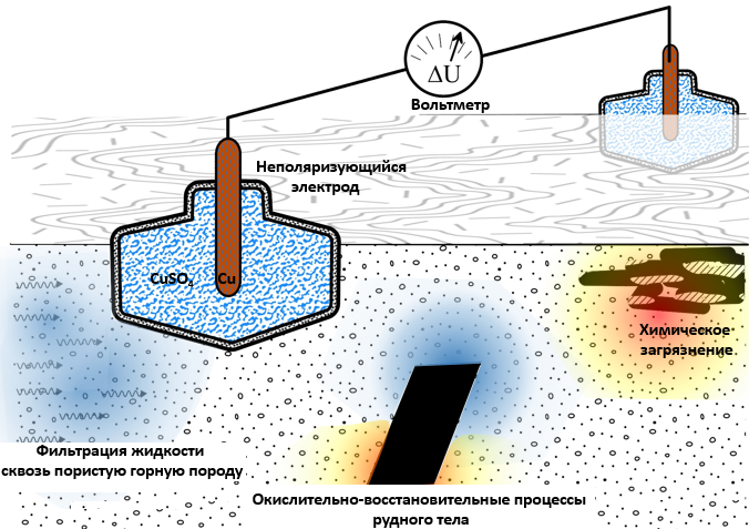 Аномалии потенциала естественного электрического поля могут наблюдаться в связи с проявлением: -окислительно-восстановительных процессов, связанных с формированием «природных гальванических элементов» в виде неравномерно окисляющихся по глубине рудных тел; -фильтрационных потенциалов, связанных с направленным течением поровой жидкости в горных породах; -диффузионно-адсорбционных потенциалов, связанных с различиями в пористости пород и минерализации поровой жидкости. Регистрация потенциалов ЕП осуществляется с помощью неполяризующихся электродов и милливольтметра с высоким входным сопротивлением Методика работы заключается в измерении разности потенциалов между рядовыми точками наблюдения и базовой точкой. Для учета остаточной поляризации электродов применяют способ измерения «петлей» с периодическим возвращением на опорную точку и корректировкой данных на рядовых точках съёмки. В некоторых случаях удобен способ измерения градиента потенциала естественного электрического поля, где по профилю работ перемещается пара электродов с постоянным разносом. Шаг по профилю и разнос электродов выбираются исходя из конкретных геологических задач, но обычно составляет первые десятки метров.