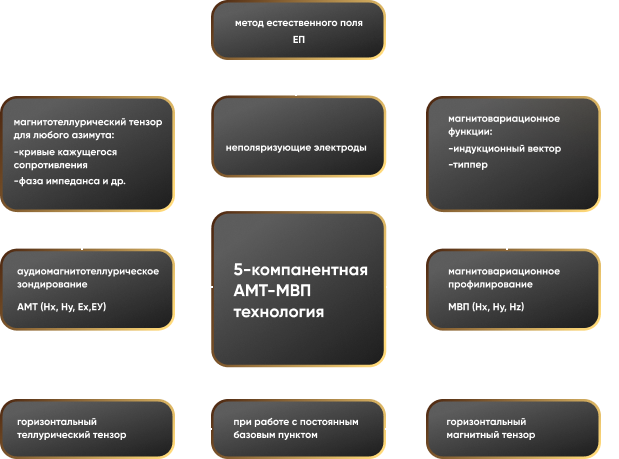 Современная магнитотеллурика включают в себя 2 типа исследований – магнитотеллурическое зондирование (АМТ) и магнитовариационное профилирование (МВП). Эти методы известны с середины прошлого века и успешно применяются для решения широкого круга задач. Особенности современной аппаратуры позволяют успешно и максимально эффективно работать в различных погодных и территориальных условиях, не нанося при этом вред окружающей среде. В качестве источника в методе (А)МТ-МВП используется естественное переменное электромагнитное поле Земли. Высокочастотная модификация магнитотеллурического метода называется радиомагнитотеллурическое зондирование (РМТ). В РМТ в качестве источника используются электромагнитные волны удалённых радиостанции.